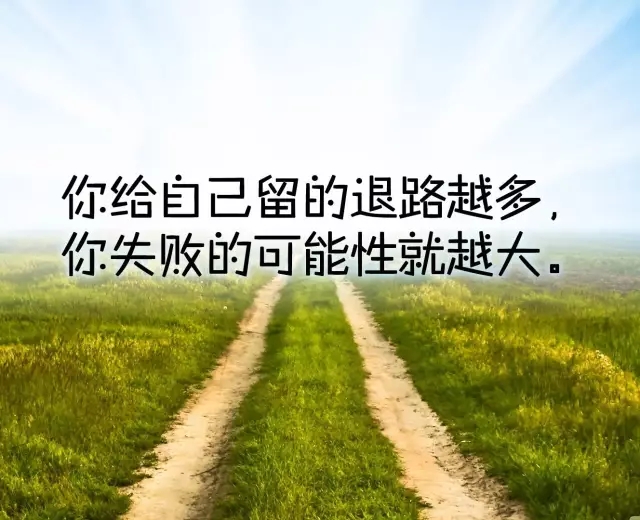 进步和成长的过程总是有许多的困难与坎坷。有时我们是由于志向不明,没有明确的目的而碌碌无为。但是还有另外一种情况,是由于我们自己贪图舒适,没有坚持到底的意志,才使得机会逝去,颗粒无收。如果不坚持,到哪里都是放弃。如果这一刻不坚持,不管再到哪里,身后总有一步可退,可退一步不会海阔天空,只是躲进自己的世界而已,而那个世界也只会越来越小。你给自己留的退路越多,你失败的可能性就越大。这句话是应该铭记在心的,时刻警戒着自己。