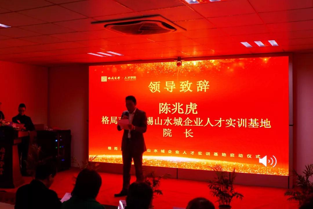 雄宇集团副总裁、格局商学无锡山水城企业人才实训基地院长陈兆虎发表致辞。他结合自身的创业经历谈到了知行合一及创造的重要性,并提出了学院发展的三大战略,即品牌战略、生态战略、及渠道战略。他表示,格局商学无锡山水城企业人才实训基地的成立,满足客户对企业不断提升服务能力、建立高效运营管理的需求;满足员工不断提升自我素质、提升职场综合竞争力的成长需求;满足团队凝聚力、构建企业文化体系的需求;是建设人才梯队的重要举措,对培养高素质、专业化和应用型的人才、提升战略格局具有里程碑意义。