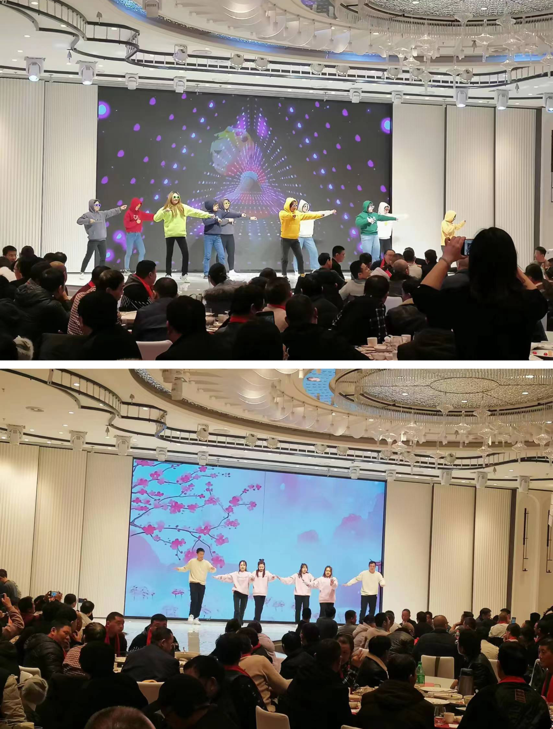 大家在欣赏文艺节目的同时,围桌而坐,享受着美味佳肴。集团领导逐桌敬酒,大家觥筹交错,互致问候。与此同时,抽奖活动也在文艺表演中穿插进行。随着一阵阵尖叫声、嬉闹声,毛毯、足浴桶、电炸锅、平板电脑、电动自行车等奖品也纷纷“名花有主”。
