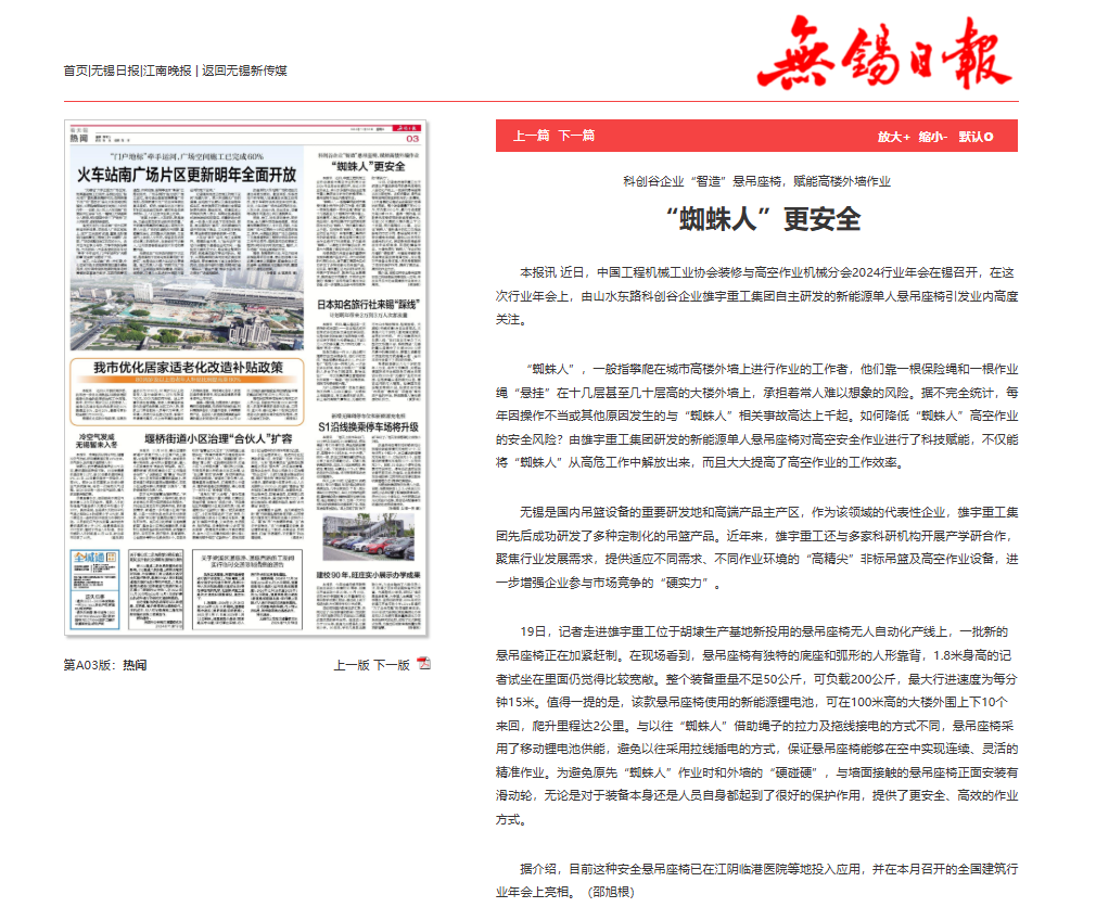 当前位置:首页 - 新闻中心 - 企业动态 - 科创谷企业“智造”悬吊座椅,赋能高楼外墙作业——《无锡日报》